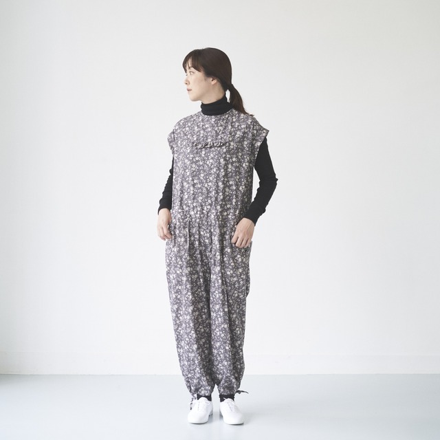 サイズ N.P~着丈142c バスト巾56.5c 裄丈27.5c 袖口幅23c 裾幅27c 渡り38c ウエスト幅55c 素材 綿 100% リバティプリントのオールインワン 前にポイントでフリルをつけ、リバティ柄と合わせることで馴染みが良く大人っぽく仕上がりました 後1つ釦あきで深いスリット、袖は肩から少し落ちたフレンチスリーブ 春夏は見えてもかわいいインナーと合わせたり、秋冬は長袖カットソーやブラウスと合わせたり ウエストには共リボンでギュッと寄せたり、ルーズに緩めたり 裾口にも共リボン入りでストレートにしたり絞っても◎ 見えないですが、こだわったポイントはポケット袋布に開いたスリットから手を入れてインナーを整えられるところです。 淡いラベンダーグレーが華やかながらもしっとり落ち着いて モデル身長:162c 品番 SW-144