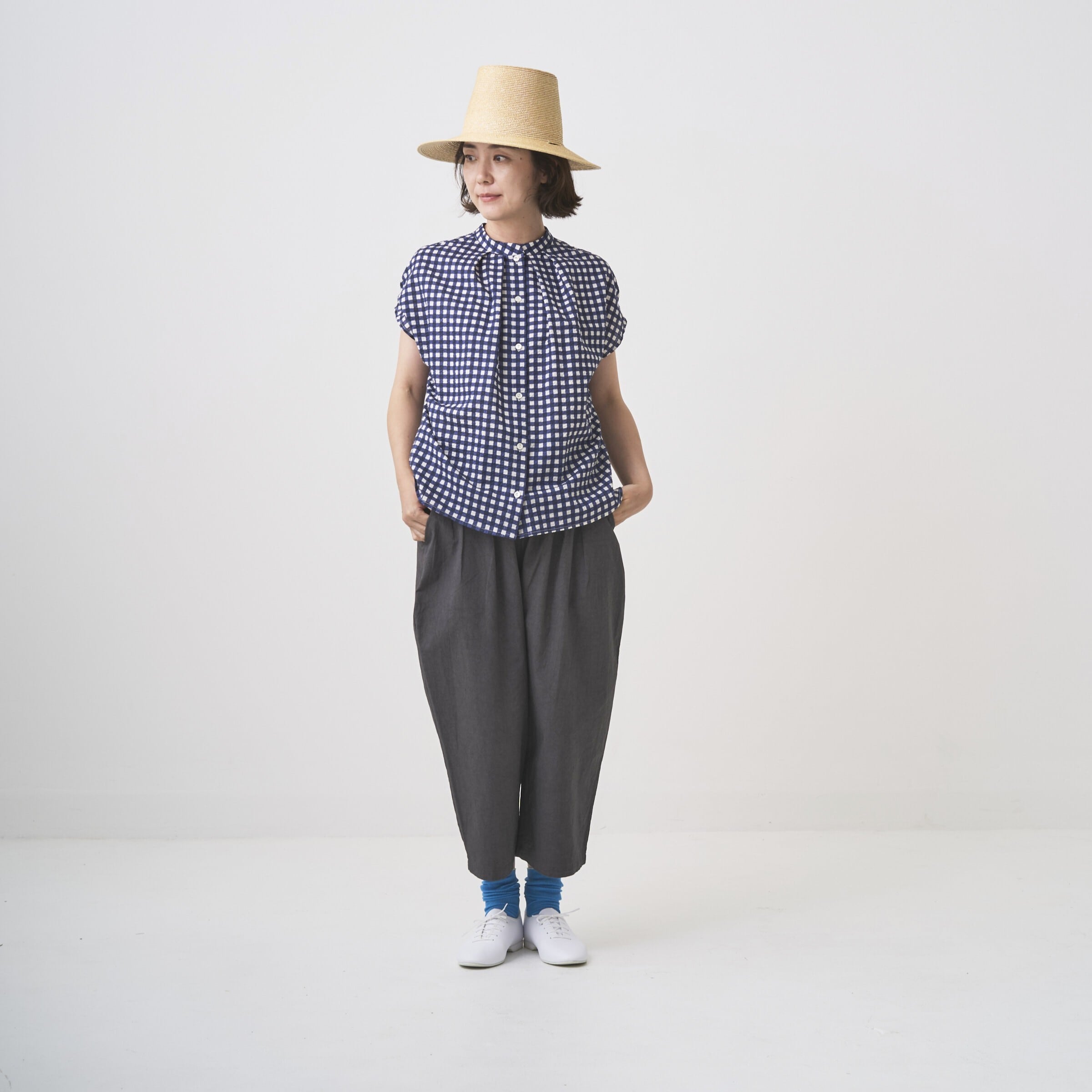 素材はコットンのランダムなギンガムプリントサッカー生地で軽く、暑い夏にも大活躍なブラウスです