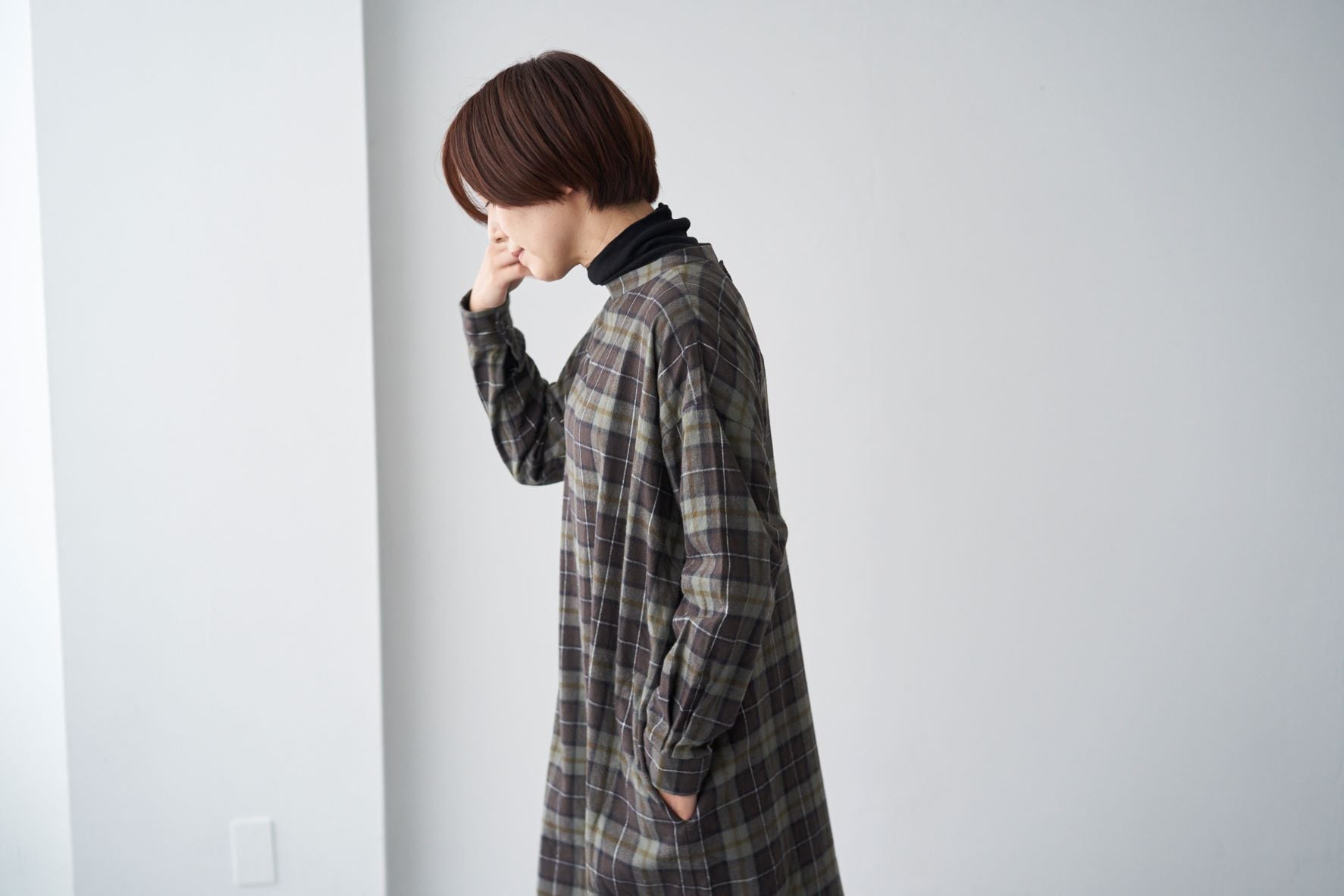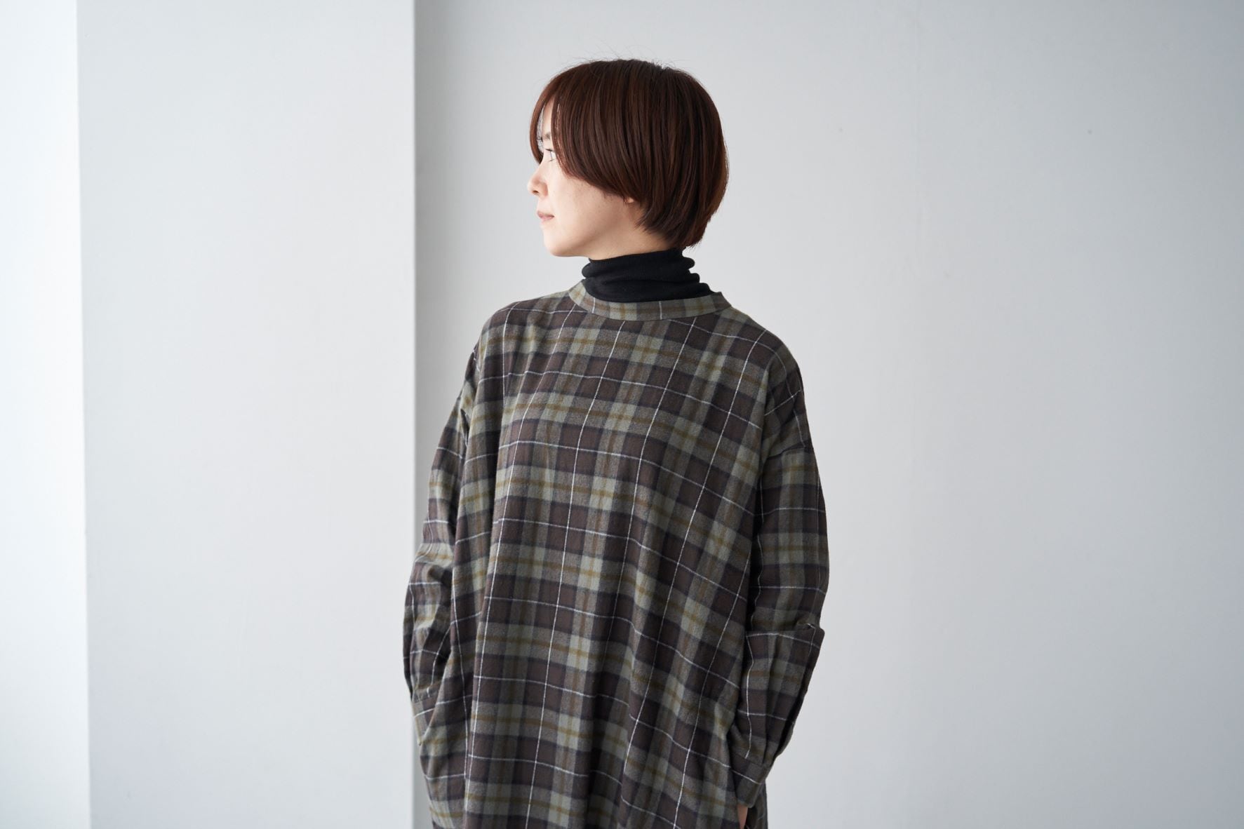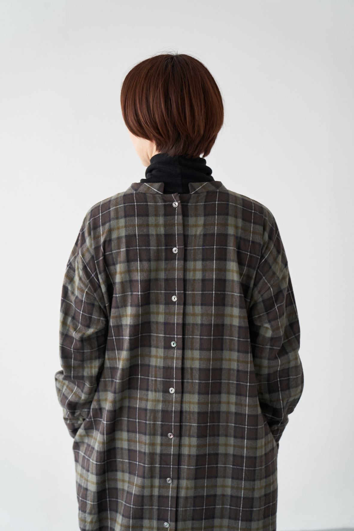 チェックの起毛コットンが温かく、ノスタルジックでありながら、長方形シルエットでスッキリ着られます