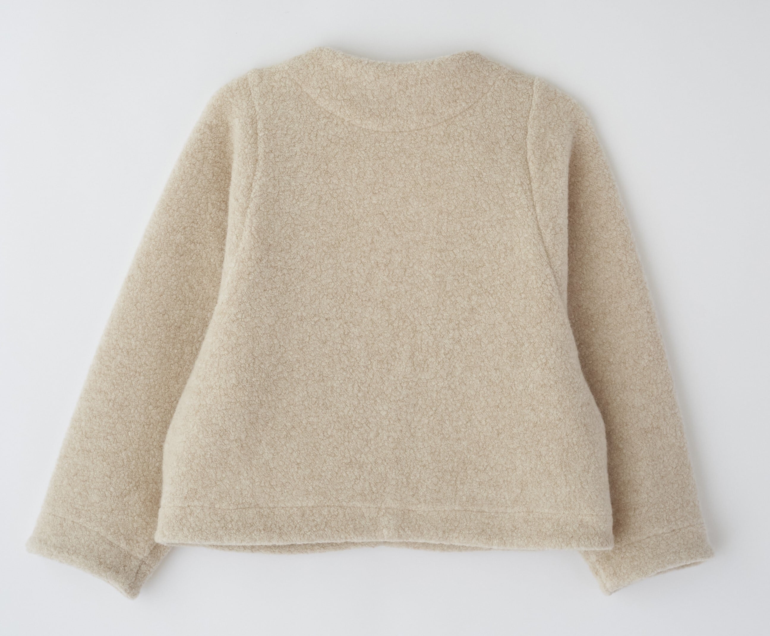 前あきには敢えて釦を無くし、アームホールを大きく取り窮屈感がないぶん、肩を小さく、着丈を短くした絶妙バランス。