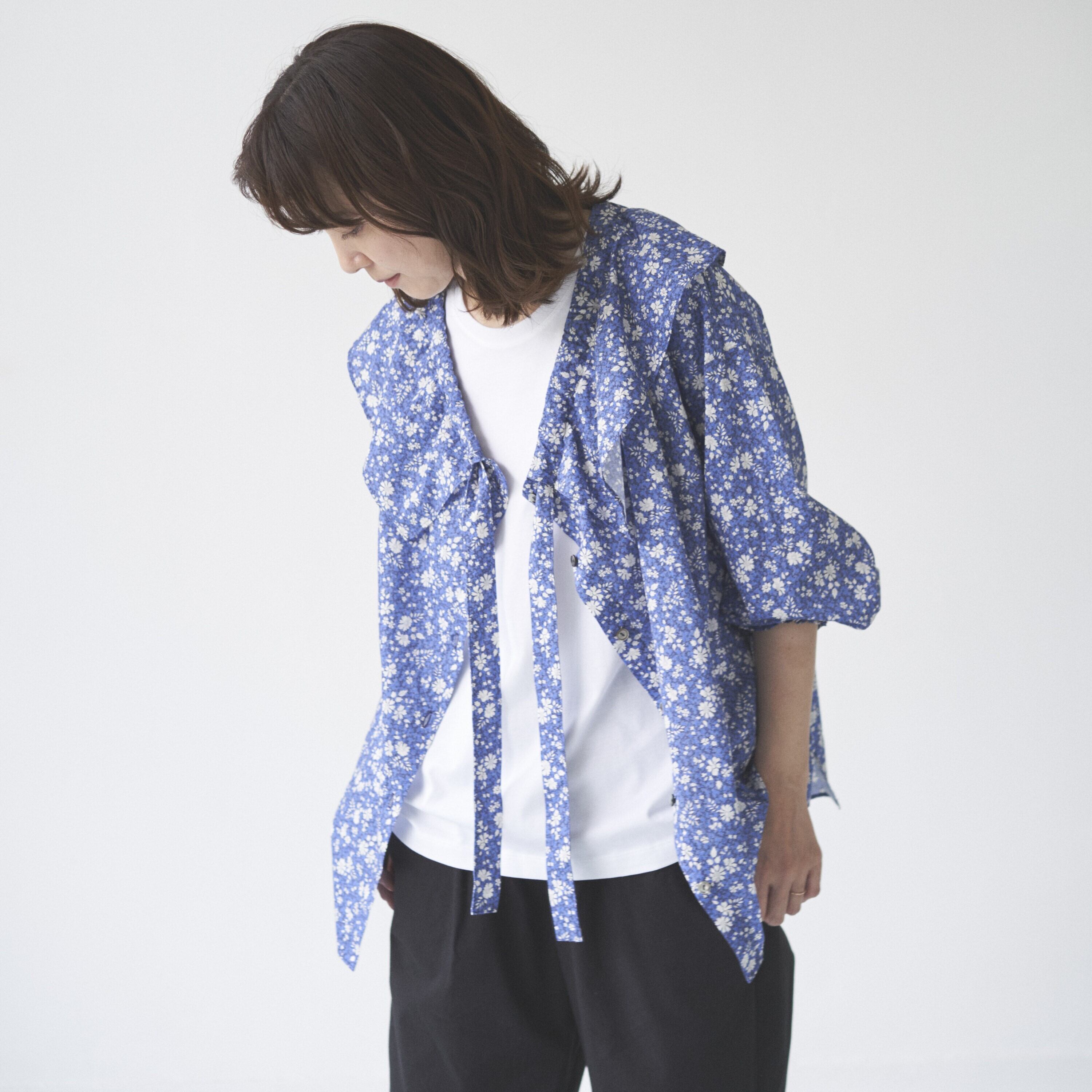 リバティプリントのラッフル衿ブラウス